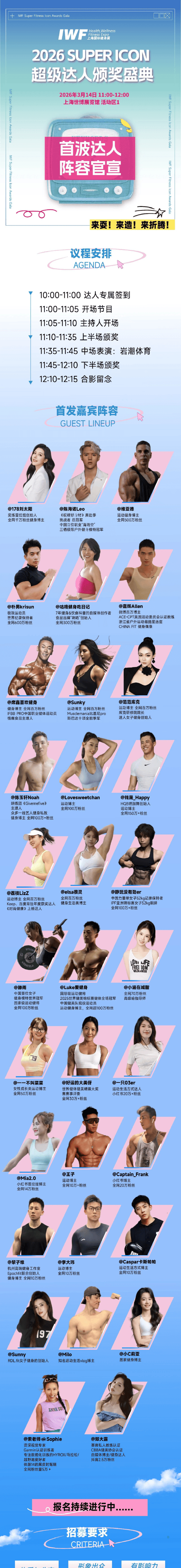 2026年3月14日11:00,SUPER ICON超等达人颁奖盛典将于第十三届IWF上海邦际健身揭示场恢弘实行。这里不只是行业领武士物与IP的集聚地,更是赞扬标杆达人、共探行业另日的重点舞台。
