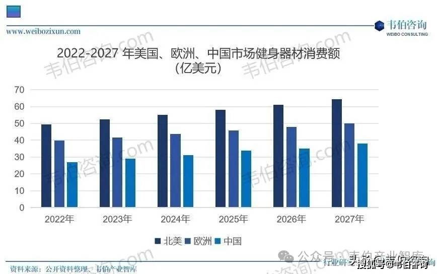 美邦、欧洲健身工业起步较早,健身东西消费商场界限处于环球领先名望。健身是欧美邦度越发美邦的硬核需求。2022年北美商场健身东西消费额为49.43亿美元,欧洲商场健身东西消费额为39.9亿美元,中邦商场健身东西消费额为27.1亿美元。估计2027年北美、欧洲、中邦商场健身东西消费额将别离抵达64.39亿美元、49.88亿美元以及37.91亿美元。