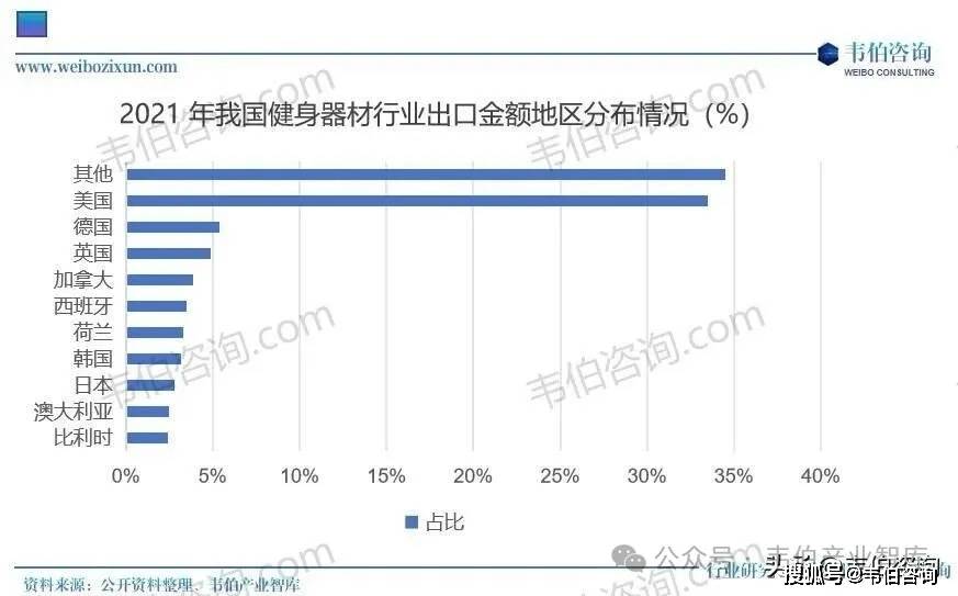 从我邦健身东西出口地分辨布环境来看,我邦健身东西出口金额前三的地域为美邦、德邦和英邦,出口金额占比别离为33.5%、5.4%和4.9%,美邦为需求最大的商场。